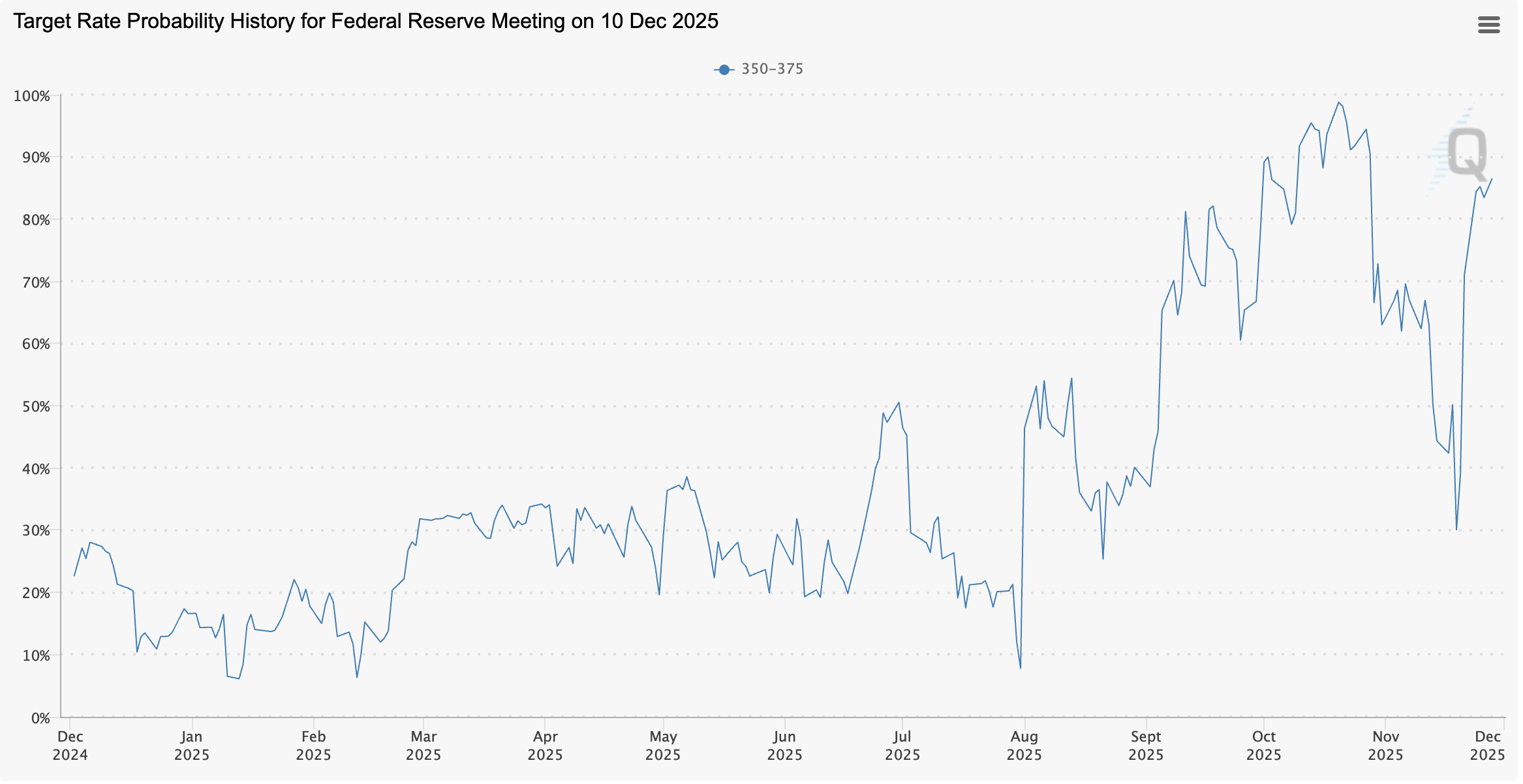 The CME FedWatch tool showed markets pricing in an 87% probability of a 25 bps rate cut at next week’s FOMC meeting. That sharp rise from just weeks prior—when expectations briefly dipped as low as 20%—has been a central driver of momentum in equities and bond yields.