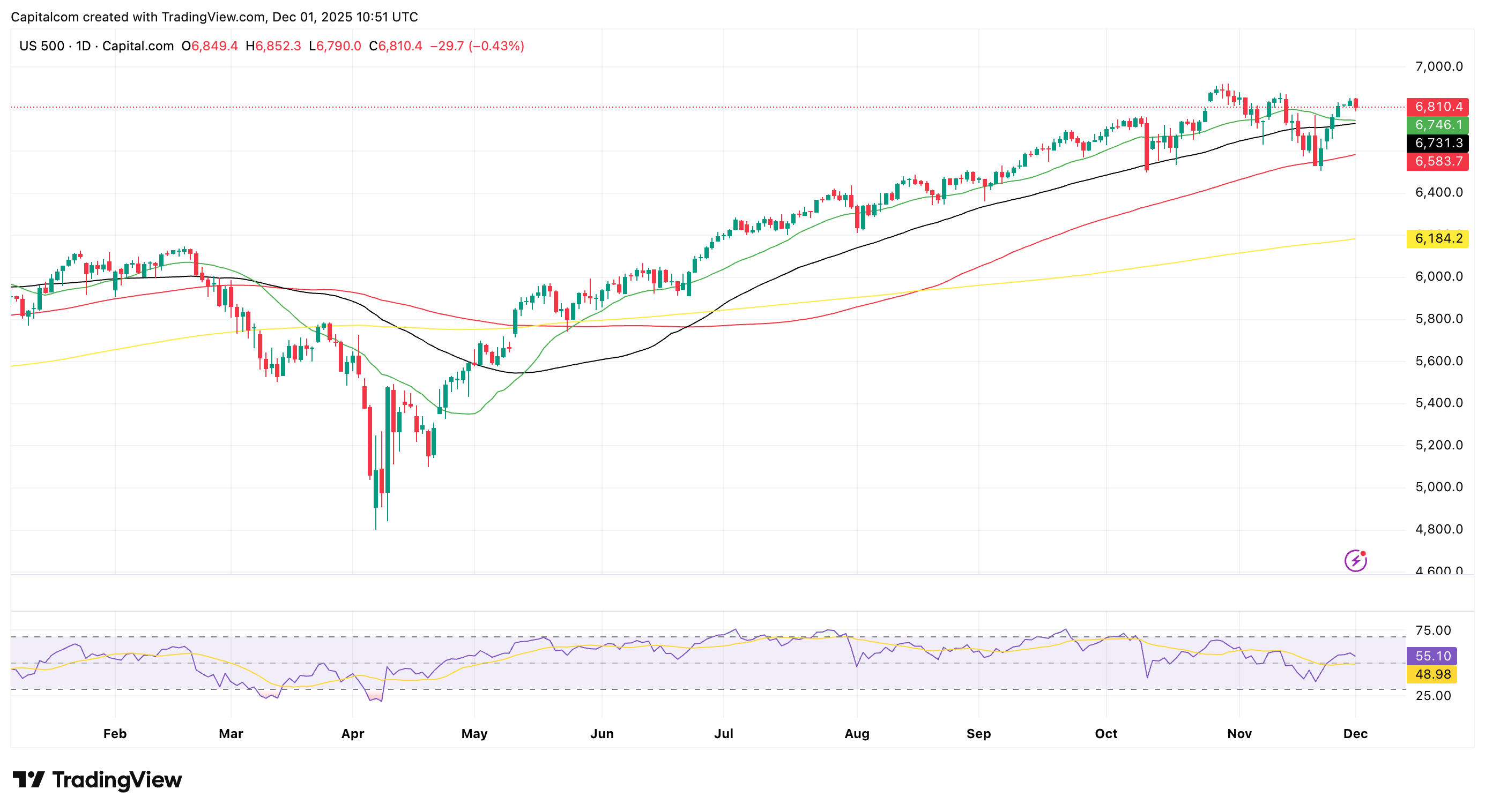Despite a strong recovery in U.S. indices last week, the tone turned cautious entering December. Futures pointed to a softer open, with traders debating whether recent gains were merely profit-taking after November’s rebound or a sign of deeper unease.