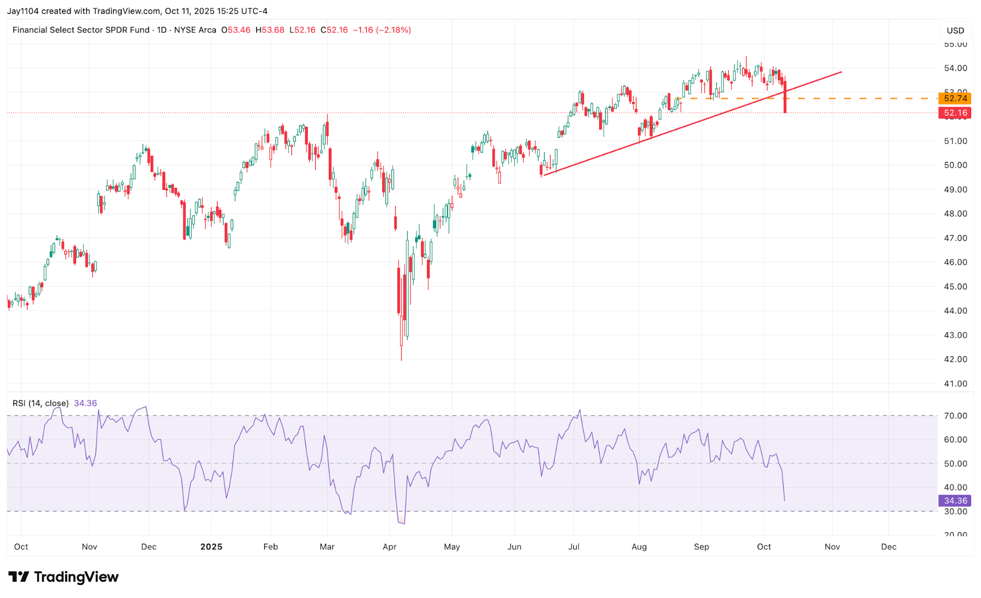 It wasn’t much better for the big bank financials either, with the Financial Select Sector SPDR (XLF) ETF dropping by more than 2% and also slicing through a major uptrend and support around $52.90. The big decline is going to put even extra focus on the banks that report earnings results the week of 13 October, with JPMorgan, Goldman Sachs, Citigroup, and Wells Fargo reporting on 14 October, and Bank of America and Morgan Stanley on 15 October.
