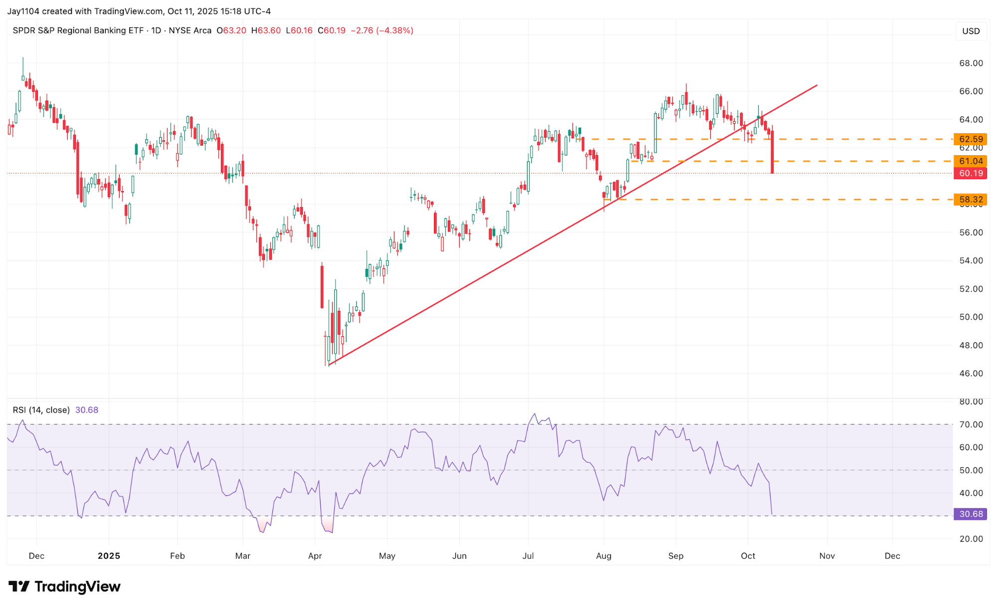 The weakness in private equity stocks appears to have spread to regional banks, as evidenced by the S&P Regional Bank ETF (KRE) falling by more than 4% on Friday alone. More importantly, the ETF broke through three layers of support, dropping below the uptrend trendline that began in April, as well as horizontal support at $62.50 and $61.00. The next notable layer of support for the KRE does not appear until around $58.30, while the previous support levels are now likely to act as resistance.