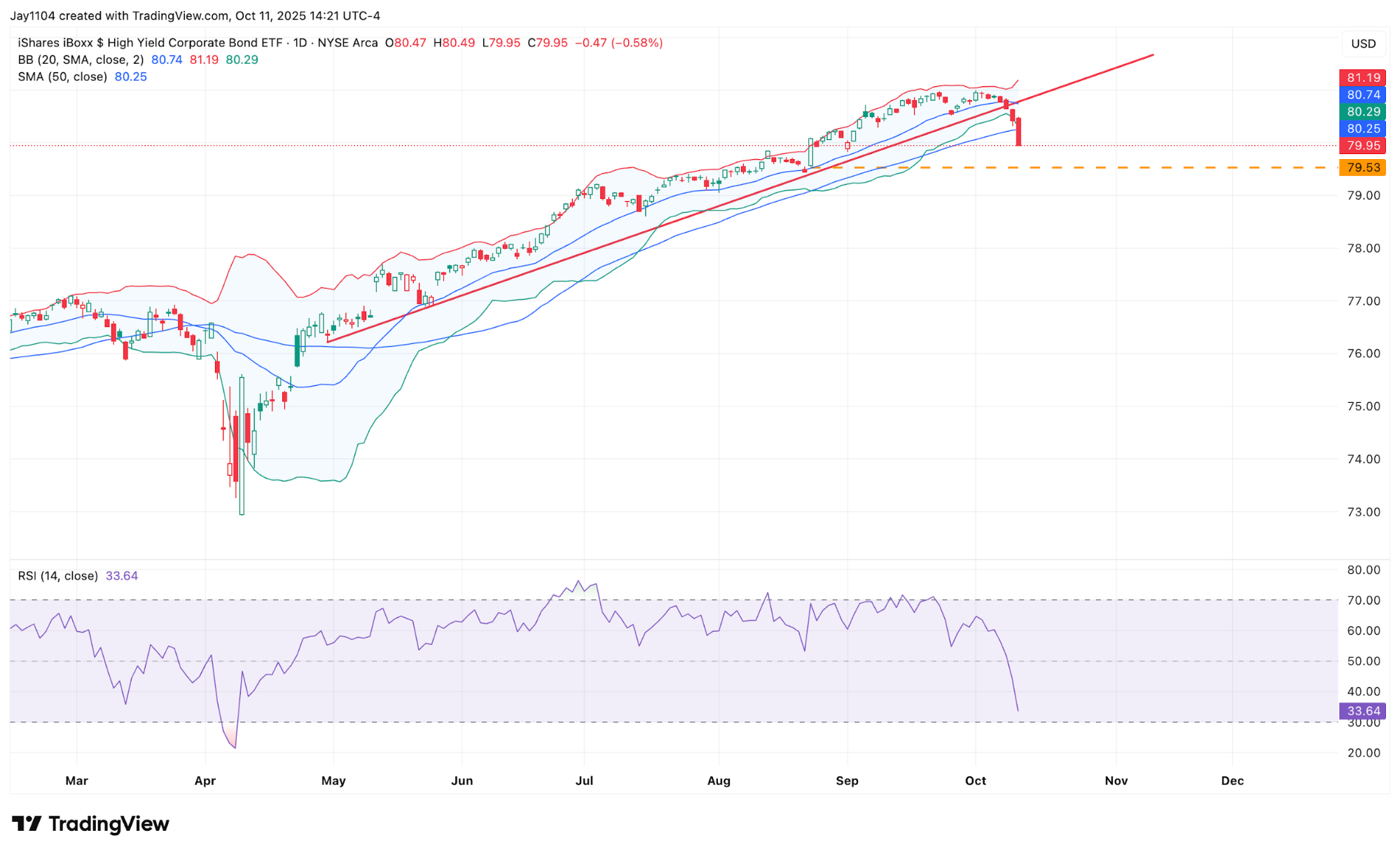 The iShares High Yield Corporate Bond ETF (HYG) also fell sharply, dropping below its 50-day moving average. There appears to be a reasonable chance that the HYG will find support around $79.50. At present, the ETF is approaching oversold territory, trading below the lower Bollinger Band, while the RSI is quickly nearing 30. These oversold conditions indicate that the HYG is due to consolidate for at least a day or two.