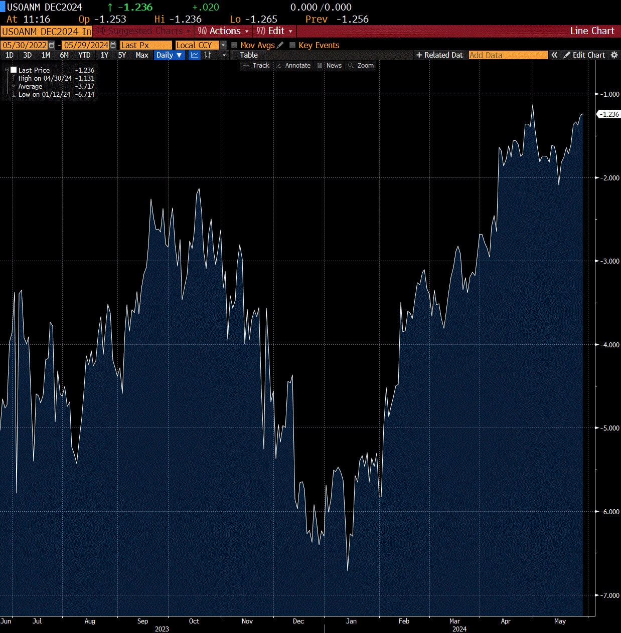 Following the last FOMC meeting, at which the Fed pushed back on the need for further policy tightening and suggested rate cuts this year were still possible, US interest rate futures have shifted to imply a delayed start to the Fed’s next cutting cycle and fewer cuts by the end of 2024. The markets have deferred the timing of the first rate cut to December, with the December futures (below) contract implying less than a 25% chance of two cuts this year.