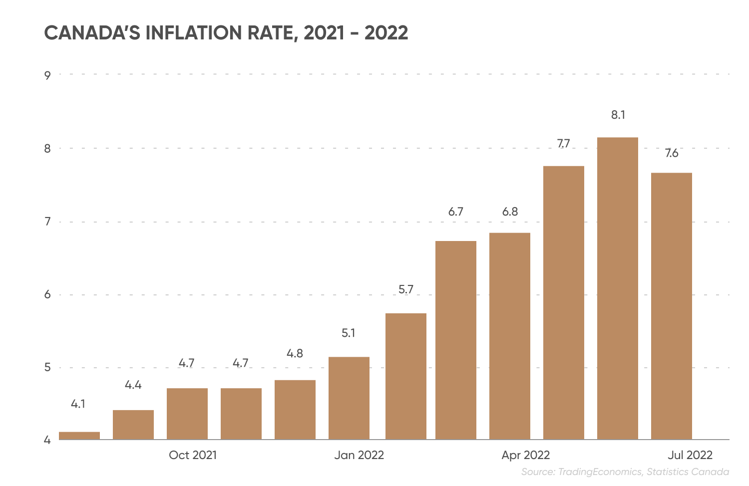 Canada’s annual inflation eased in July, with the Consumer Price Index (CPI) at 7.6%, dropping from 8.1% in June, Statistics Canada revealed in August. The deceleration was caused by slower annual growth of gasoline prices.
