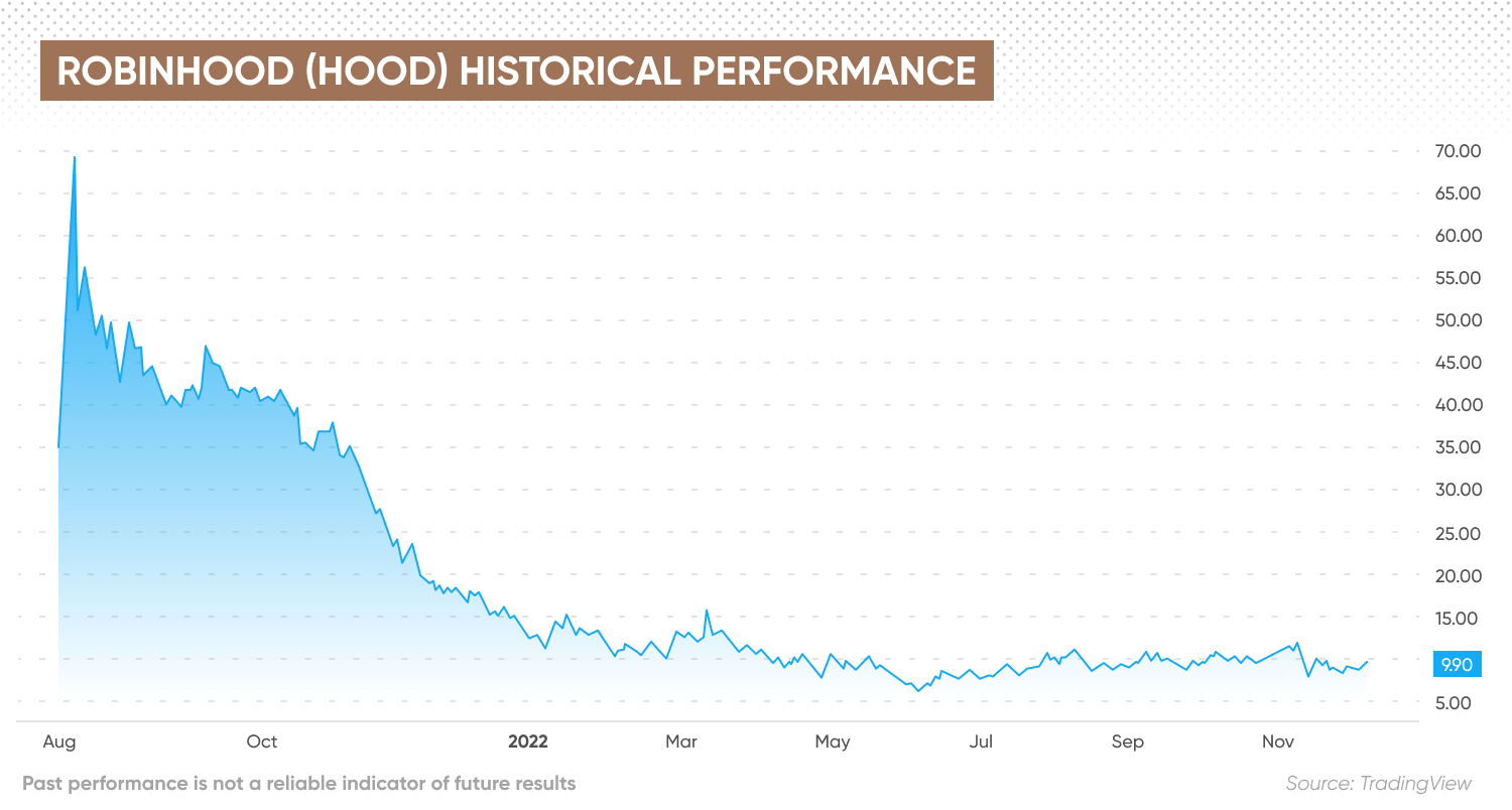 At market close on 30 November 2022, the Robinhood stock price was down to $9.59 – 86% lower than its all-time high and 48% lower than the start of this year.