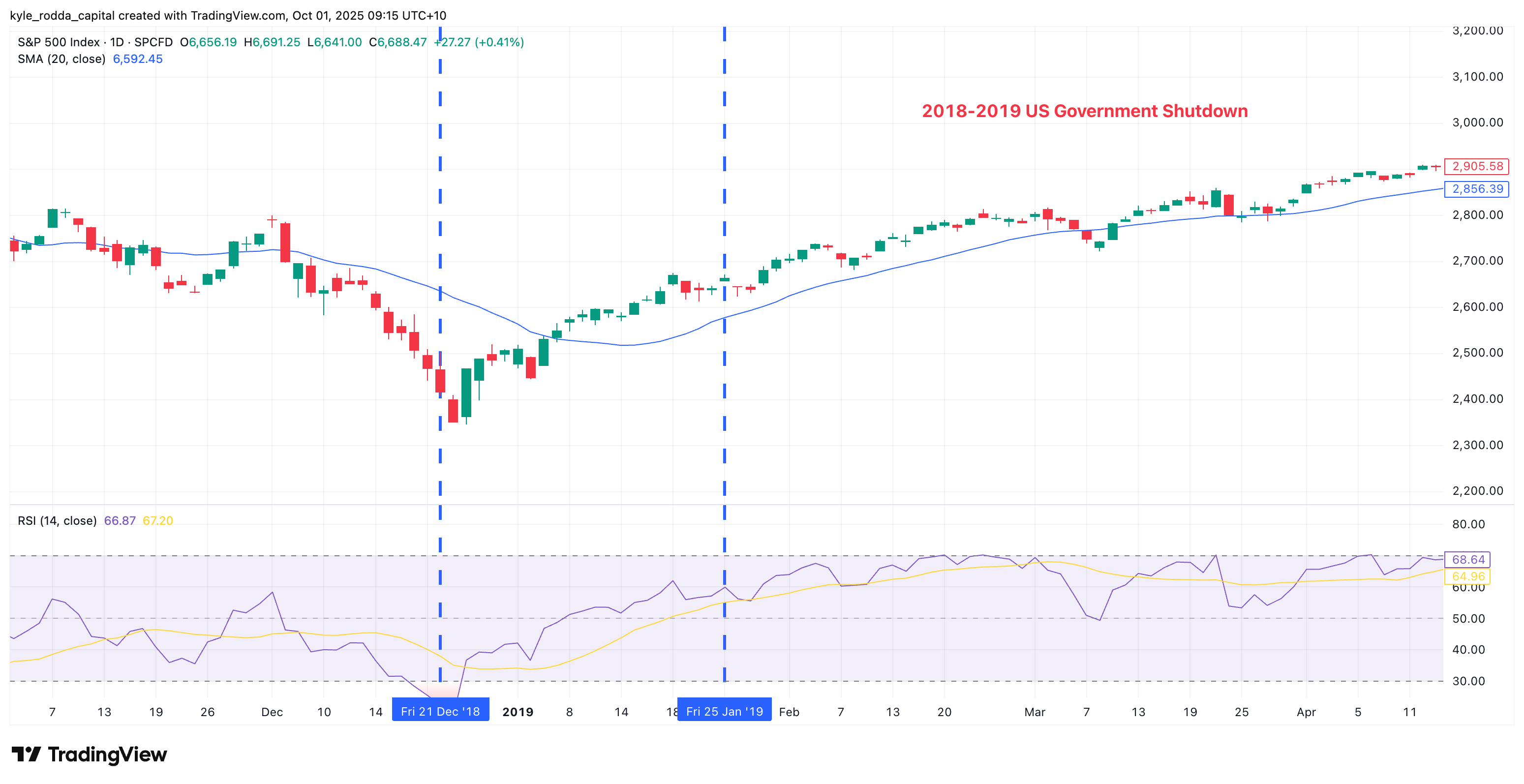 Typically, a shutdown is immaterial for markets. In fact, the 2018-2019 shutdown, which lasted for over a month, actually saw Wall Street rise. Gold prices were largely unaffected, while the impact on the Dollar and US Treasuries was negligible. The reason was because of the famous “Powell-pivot” at the end of 2018, which all but ended the Fed’s hiking cycle at the time.