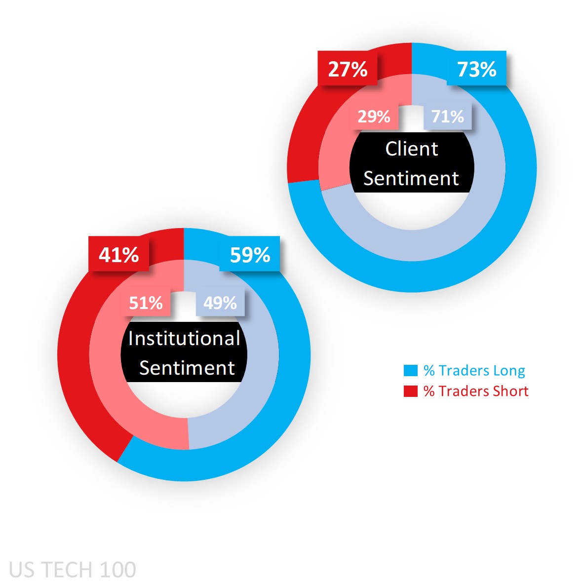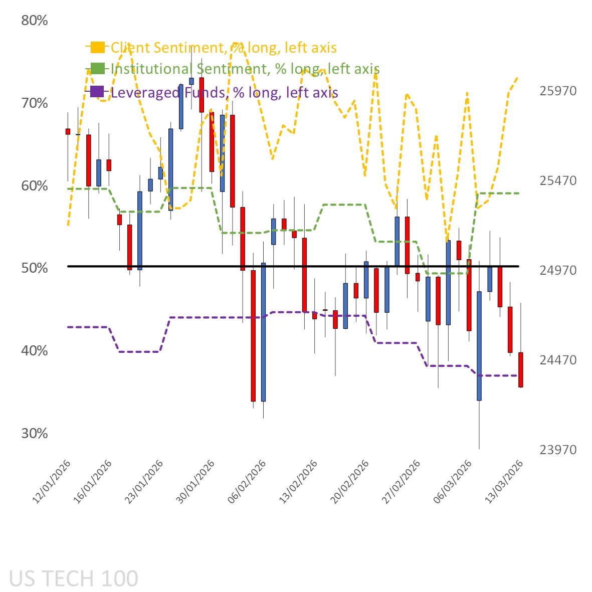 Larger speculators according to the latest CoT (Commitment of Traders) report shifted back to net long after briefly flirting with net short sentiment, and due to a significant reduction in short positions (by 24,127 lots). They remain net short in the other key U.S. equity indices however, little changed in the S&P 500 (net short 63% from 64%) and Dow 30 (net short 55% from 54%) while moving notably away from the middle in the Russell 2000 (net short 58% from 52%).