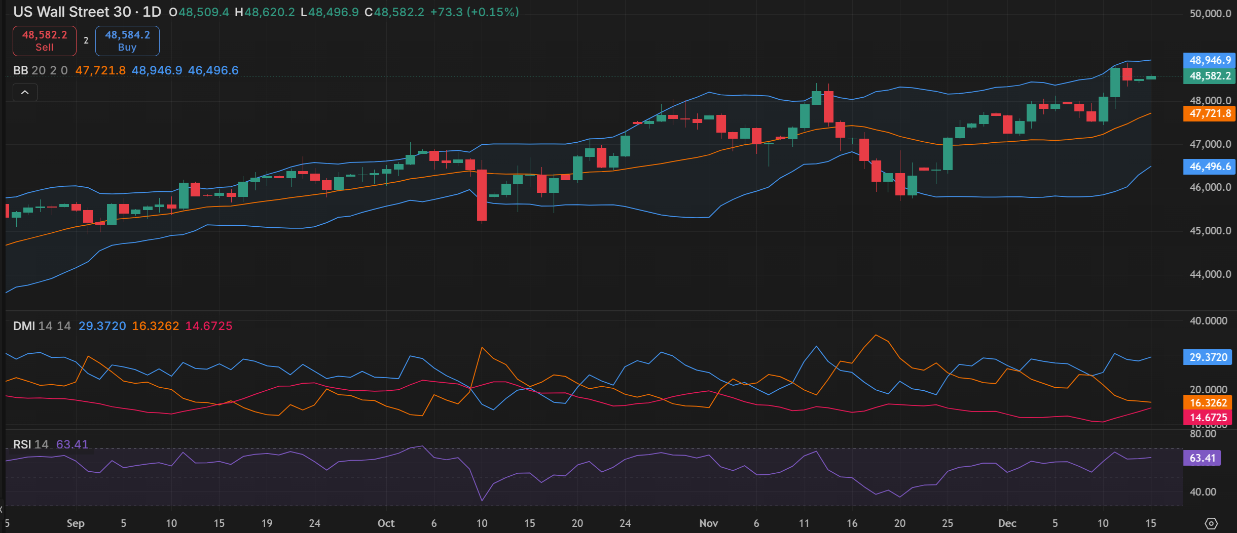Gráfico del Dow 30 en la plataforma de Capital.com con indicadores técnicos clave