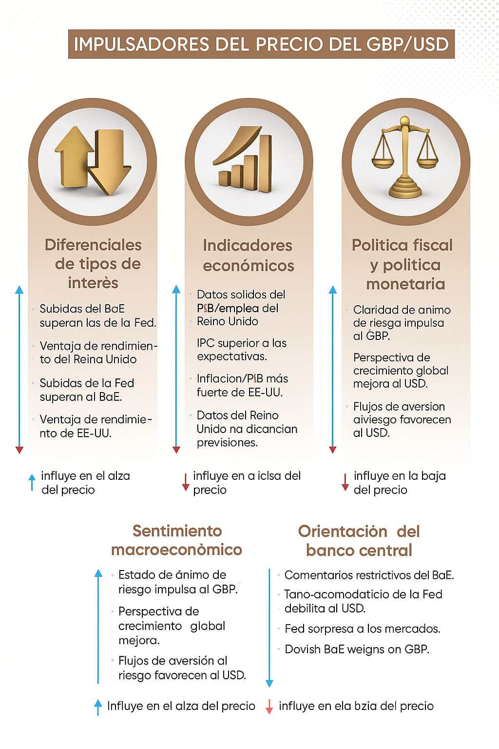El precio del GBP/USD fluctúa constantemente, influido por factores que afectan directamente la tasa de cambio (USD a GBP) y el cambio dólar/libra, como la publicación de datos económicos, la política monetaria y el sentimiento del mercado mundial.