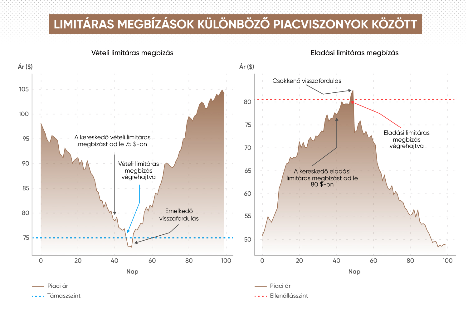 A limitáras megbízásokkal kezelhetők a pozíciók be- és kilépési pontjainak árszintjei. Ez segíthet a kereskedőknek elkerülni a kedvezőtlen piacviszonyokat és a felesleges költségeket.