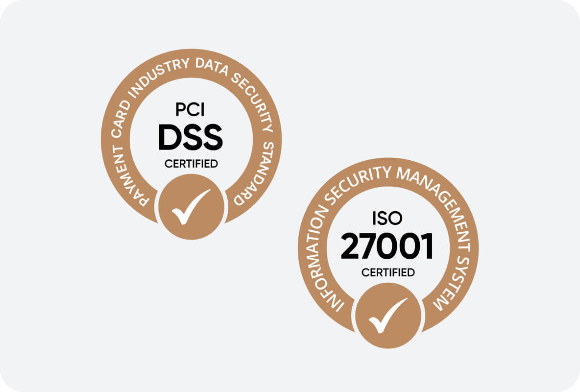 Megfelelünk az ISO 27001 szabványnak, amely egy globális standard az adatbiztonság terén, valamint PCI DSS-nek (fizetőkártyákra vonatkozó adatbiztonsági szabvány), amely segít a globális adatbiztonsági intézkedések alkalmazásában.