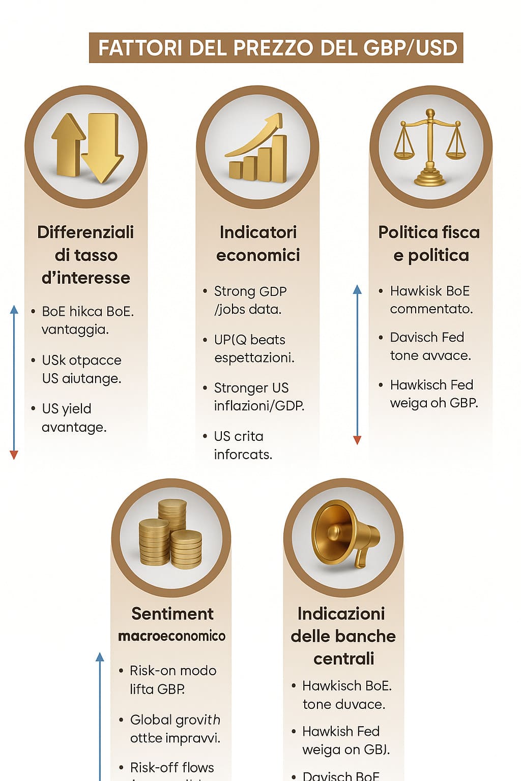 La quotazione di GBP/USD fluttua costantemente, influenzata da fattori che incidono in maniera diretta sul tasso forex (da USD a GBP) e sul cambio da dollaro a sterlina, tra cui dati economici, politica monetaria e sentiment del mercato a livello mondiale.