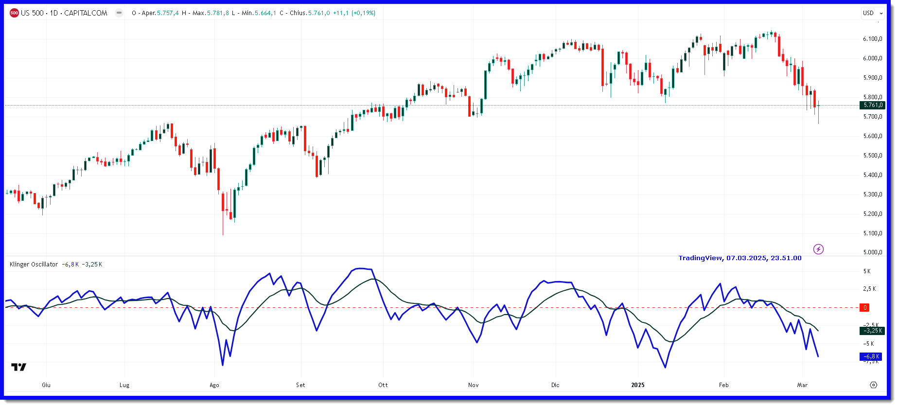Figura 1: Il Klinger Oscillator applicato al grafico del US500 (SP500) su base daily