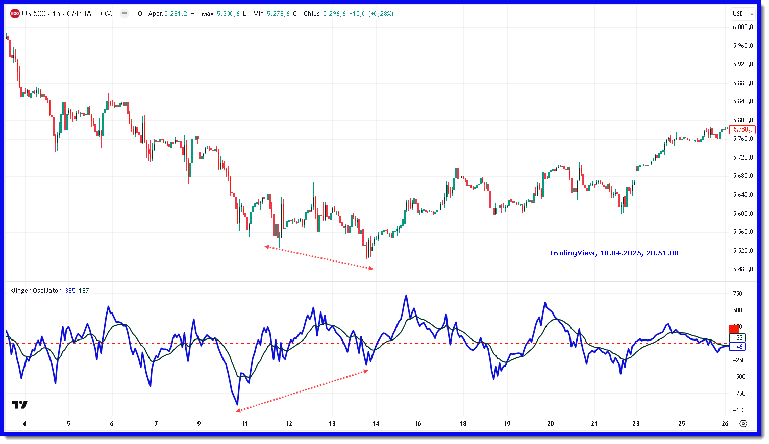 Figura 2: Divergenza rialzista con il Klinger Oscillator su US500 (SP500) a 60 minuti.