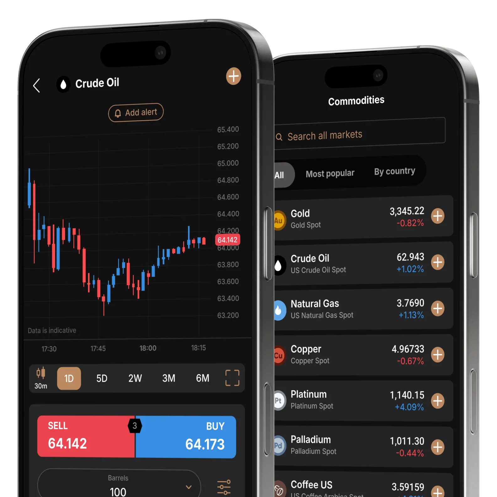 Follow market moves as they happen with price alerts, live charts and in-app news.