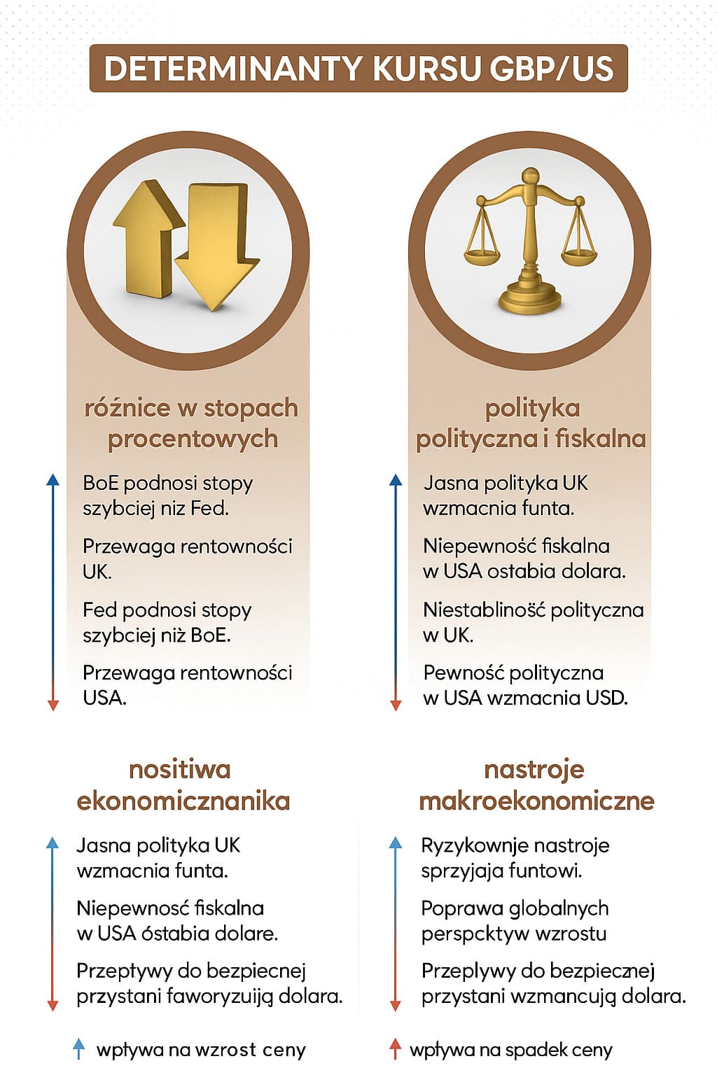 Kurs GBP/USD często reaguje gwałtownie na decyzje dotyczące stóp procentowych i oświadczenia dotyczące polityki pieniężnej Banku Anglii (BoE) oraz Rezerwy Federalnej (Fed). Podwyżki stóp procentowych lub jastrzębie komunikaty Banku Anglii historycznie wzmacniały funta brytyjskiego, podczas gdy gołębie sygnały mogą negatywnie wpływać na jego kurs. Podobnie, jastrzębie posunięcia Fed mogą wspierać siłę dolara amerykańskiego. Traderzy uważnie śledzą komunikaty banków centralnych, protokoły posiedzeń i prognozy, aby przewidywać zmiany na rynku i odpowiednio na nie reagować.