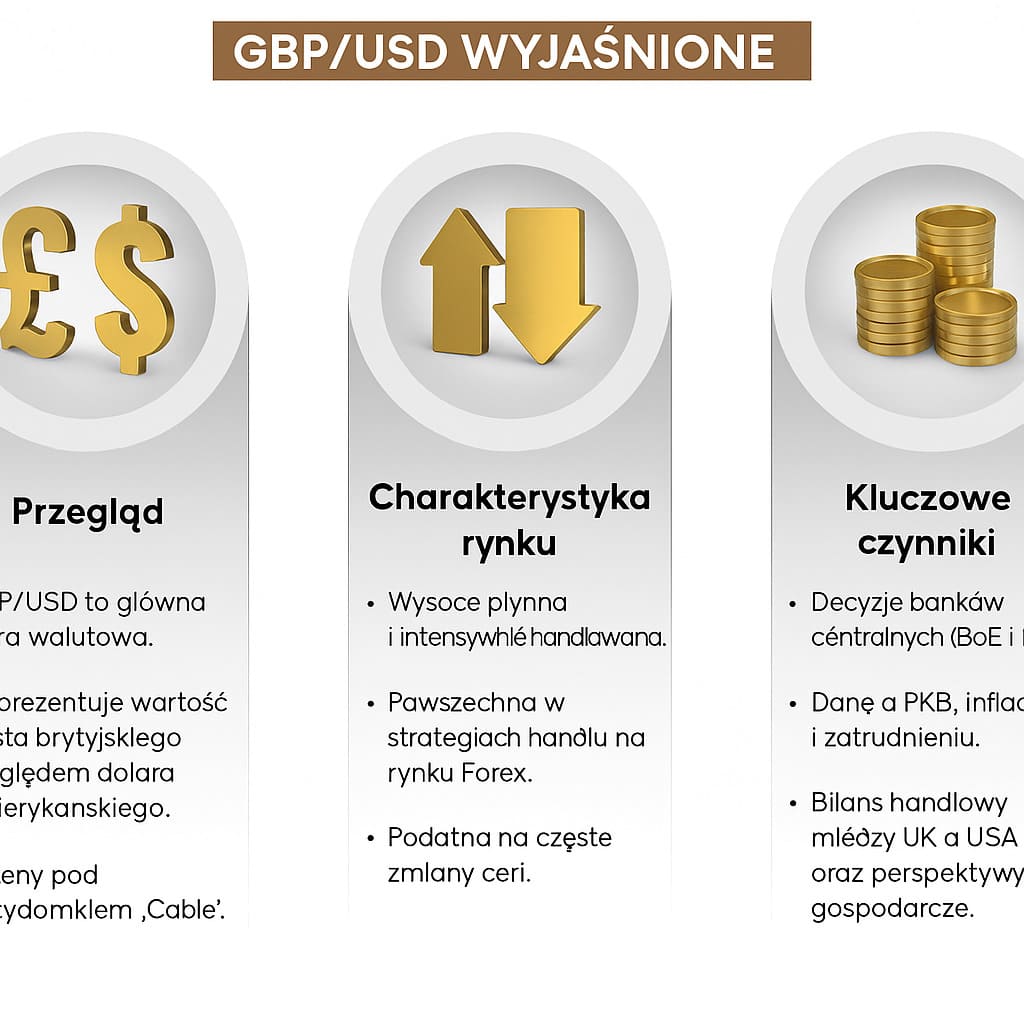 GBP/USD, powszechnie znana jako „Cable”, jest główną parą walutową reprezentującą kurs wymiany GBP na USD (stosunek funta brytyjskiego do dolara amerykańskiego). GBP/USD należy do najaktywniej handlowanych par na rynku forex, łącząc waluty z dwóch największych gospodarek świata, Wielkiej Brytanii i Stanów Zjednoczonych.