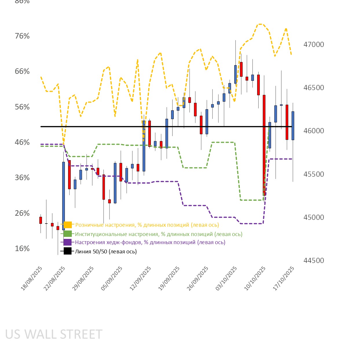 поэтому институциональные настроения основаны на предыдущих данных, где крупные спекулянты по Dow сместились из чистой короткой позиции (71%) к нейтральному уровню.