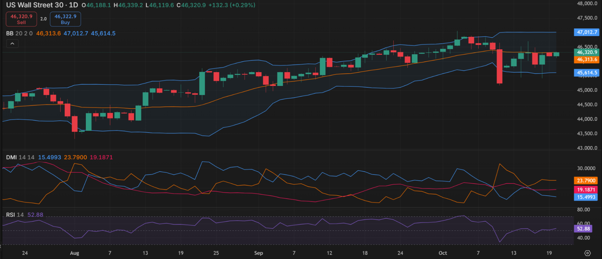 График индекса Dow 30 на платформе Capital.com с ключевыми техническими индикаторами
