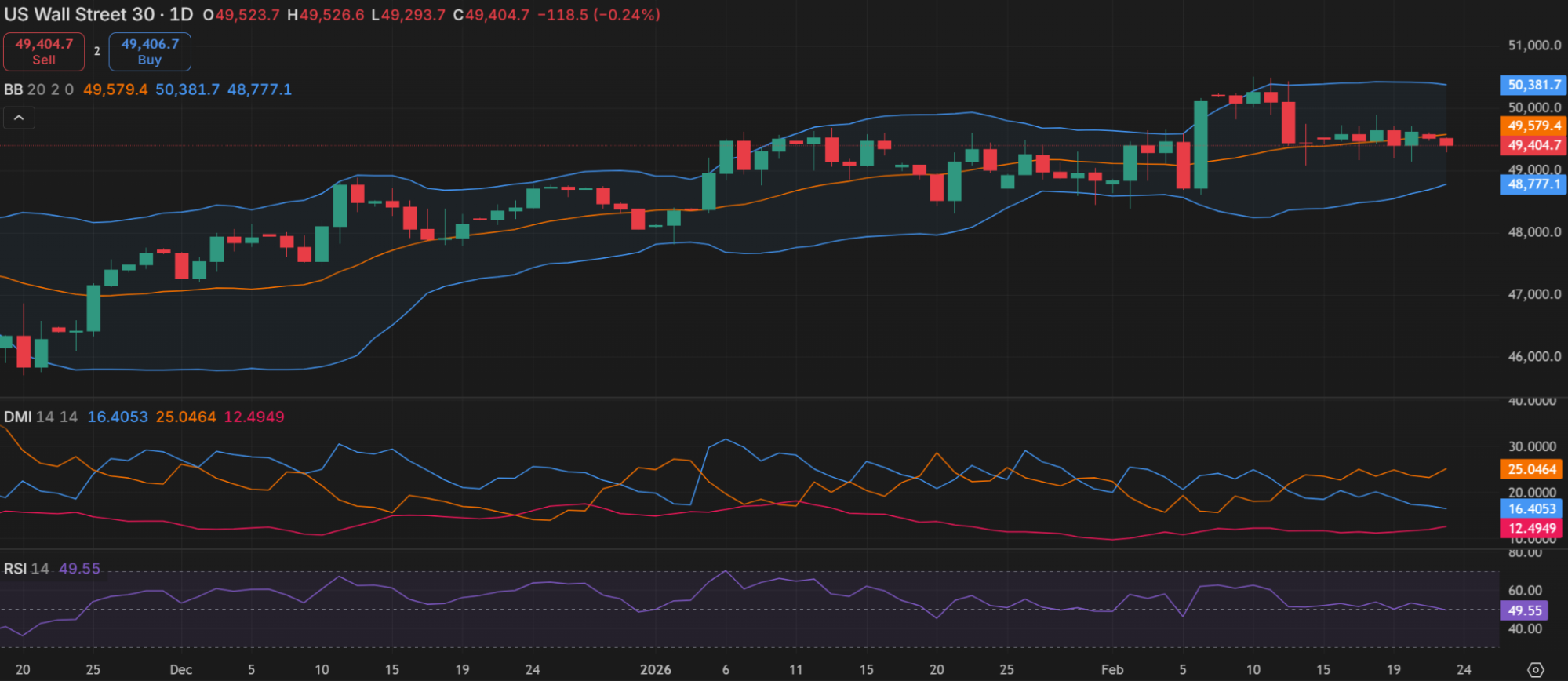 График Dow 30 на платформе Capital.com с ключевыми техническими индикаторами