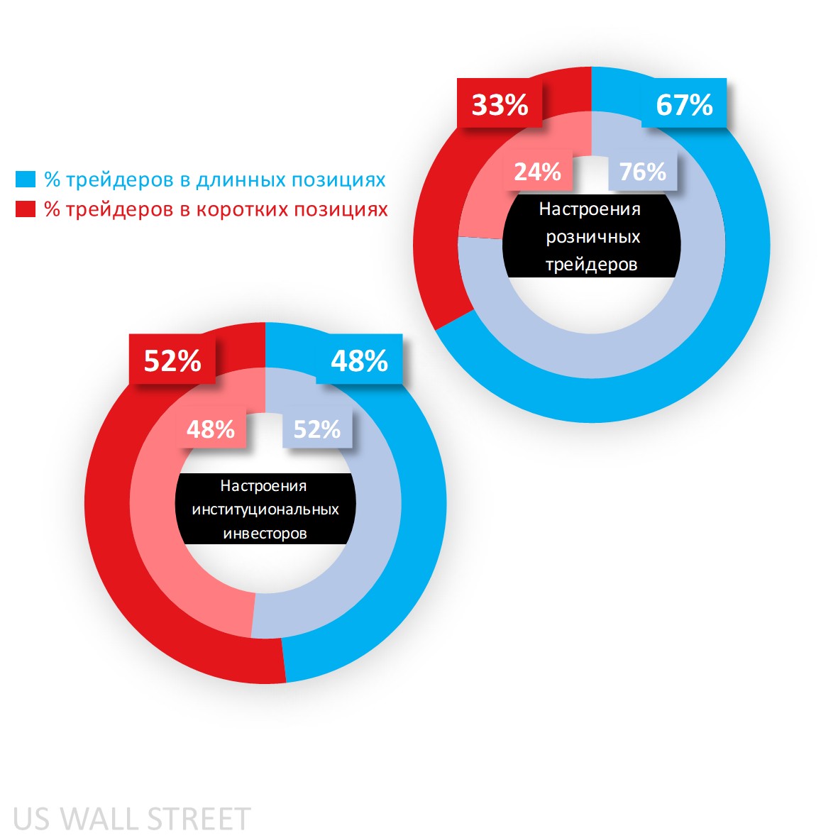 Доля покупателей снизилась с экстремальных уровней до 67%, затем восстановилась до 74% после закрытия коротких позиций. По другим индексам: S&P 500 — 75% в покупках, Nasdaq 100 — 71%, Russell 2000 — 74%.