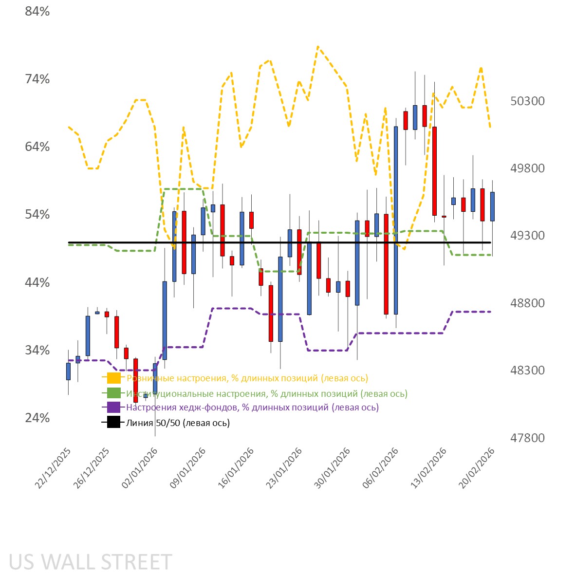 Согласно отчёту CoT, произошёл переход от чистой длинной позиции 52% к чистой короткой 52% из-за сокращения лонгов и увеличения шортов. Russell также перешёл в чистый шорт, S&P усилил чистую короткую позицию, тогда как Nasdaq увеличил чистую длинную.