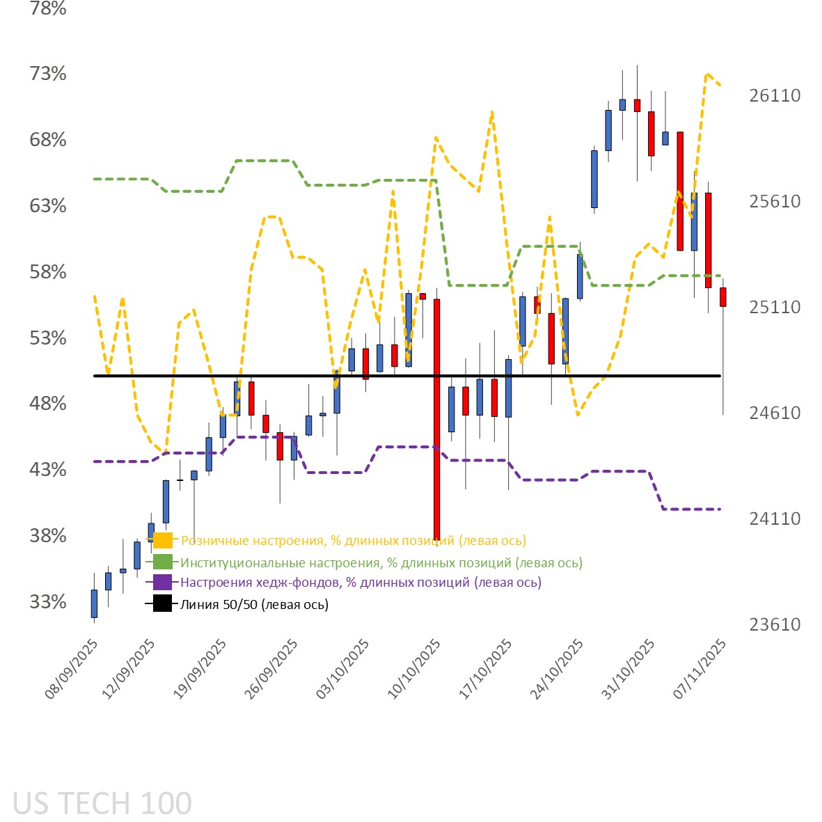 Из-за закрытия правительства США публикация отчёта CFTC задерживается, поэтому пока используются данные за сентябрь, показывающие, что спекулянты (CoT) находятся в сети 58 % длинных позиций.