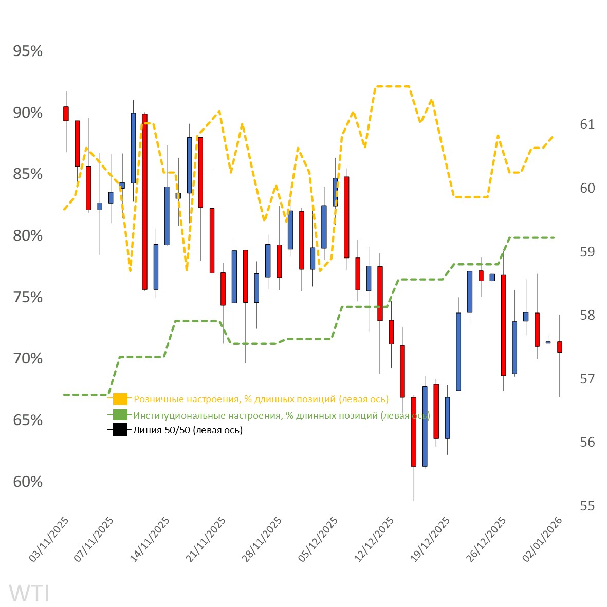 Клиентские настроения по WTI на торговой платформе Capital.com находились и продолжают находиться в зоне экстремальных покупок по инструменту «Crude Oil». Любое дальнейшее снижение цен приводило к закрытию коротких позиций, в то время как длинные позиции продолжали удерживаться. При этом контролируемые снижения поддерживают надежды диапазонных трейдеров на отскок от минимумов, которым они могут воспользоваться.