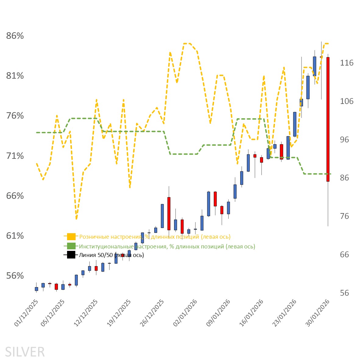 Высоковолатильная техническая картина в последнее время явно благоприятствовала конформным стратегиям пробоя, тогда как с точки зрения настроений рынок по-прежнему в основном ориентирован на покупки. Трейдеры на рынке драгоценных металлов начали эту неделю с «моря красного», однако именно резкое падение в прошлую пятницу стало настоящим сигналом тревоги. Золото снизилось от рекордных уровней около $5 600 до минимумов в районе $4,4 тыс. сегодня утром, прежде чем частично поднялось. Серебро же показало куда более значительное внутридневное снижение в процентном выражении, полностью нивелировав все достижения текущего года и упав более чем на треть от своего рекордного максимума, зафиксированного на прошлой неделе.
