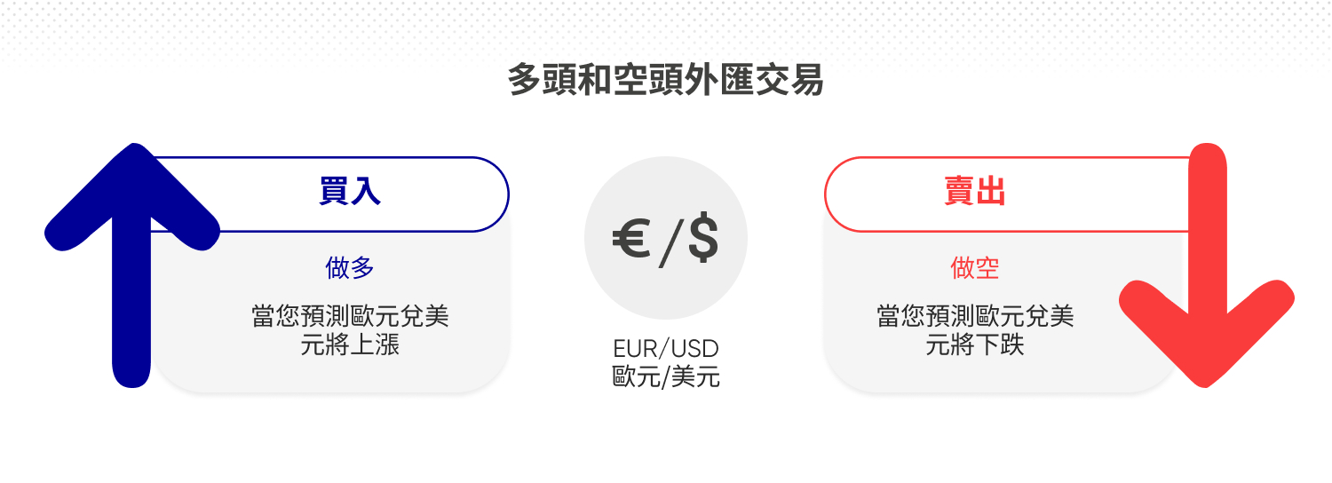 外匯交易是圍繞不同貨幣之間匯率波動進行的。交易者進行外匯交易時,旨在利用貨幣對(如 EUR/USD 或 GBP/JPY)匯率的波動來獲利。這通常透過「做多」或「做空」的方式實現,具體取決於您對該貨幣對中兩種貨幣相對走勢的判斷。